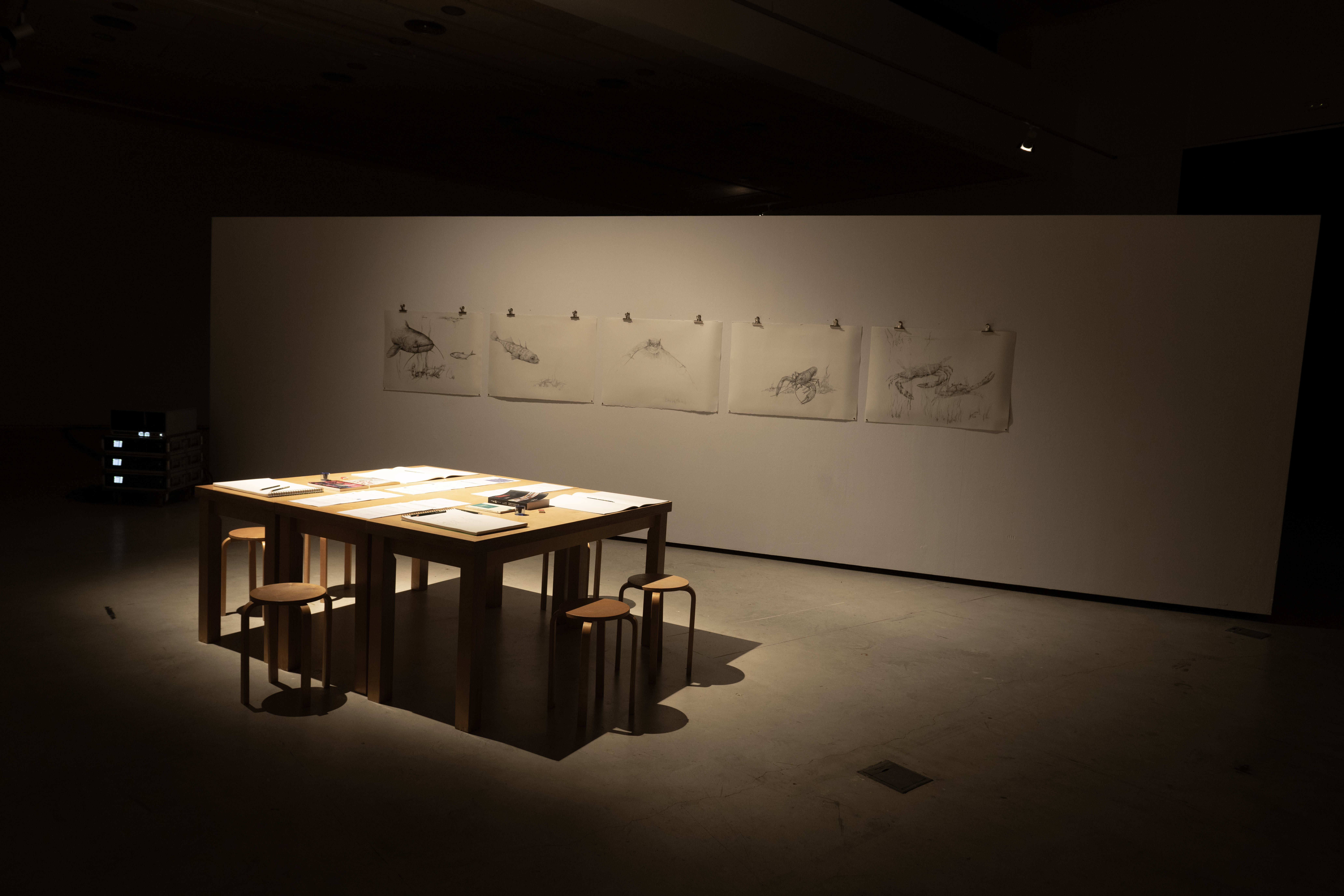 Jana collaborated with Vanessa Balagué for the selection of papers and books that we made available for the audience to read. The table also had paper and pencils for the audience to draw. Jana presented in addition her own drawings of creatures she had met during her residency.