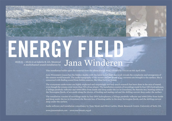 Jana is showing the 9.1 channel audio installation Energy Field, based on the album Energy Field released on Touch (UK) in 2010 and the 4.1 channel audio installation Scuttling Around in the Shallows, which is based on recordings from the Atlantic hitting the Bay of Biscay, of sea urchins, sea snails and cod from fjords in the north of Norway, from hunting seithe and haddock on the west coast of Norway, and water insects from Russia and Thailand.