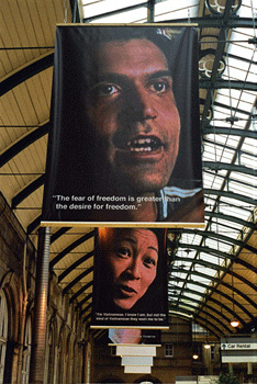 The installation consisted of six images with texts taken from interviews made for the documentary film Velkommen hjem (Welcome Home), directed by Trond Kvist in 2002 and produced by Piraya Film A/S.