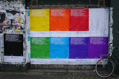 This project brings 12 artists together working on a collective experiment on the relation between colour and sound, departing from the 7 colours of the rainbow, with white and black added. Each artist and/or collective works on a specific colour, using both intuition and scientific sources, and will produce a looped sound piece. After approximately one month of experiments, all artists come together in Antwerp for some days, after which these individual works will be synthesized into one collective installation, made up of 9 sound works played simultaneously.