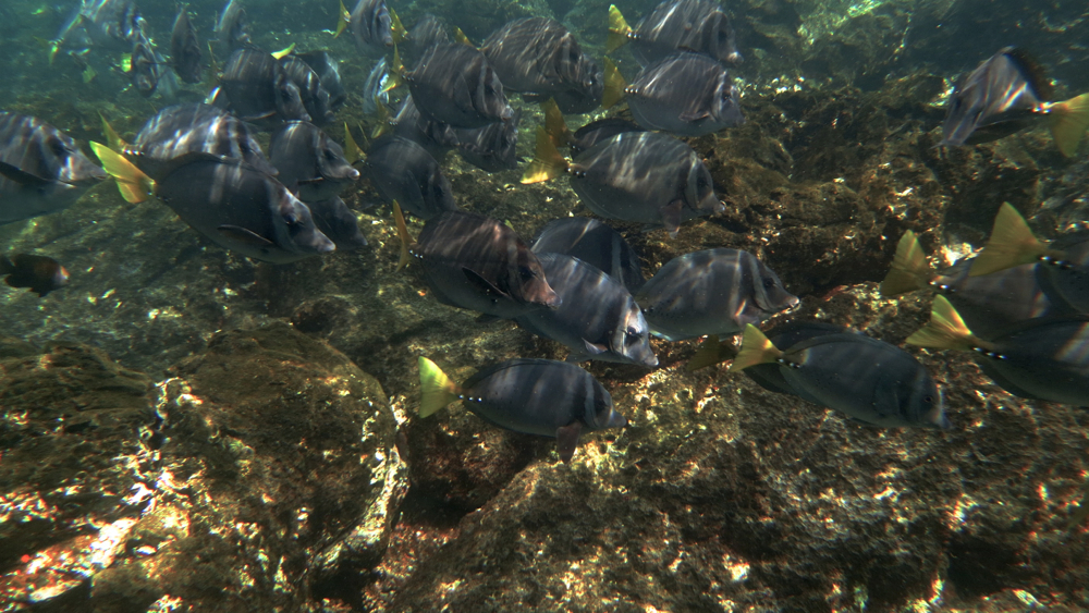 I found several spawning aggregation sounds today. Since full moon yesterday it is likely to be spawning behaviour. The sea in Coiba National park has a large variety of species, this is a school of Razor Surgeonfish, Prionurus laticlavius.