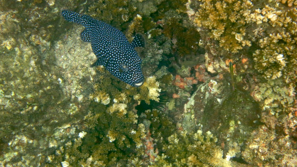 Guineafowl Pufferfish Aronthron meleagris. It changes its colour from dark purple to yellow.